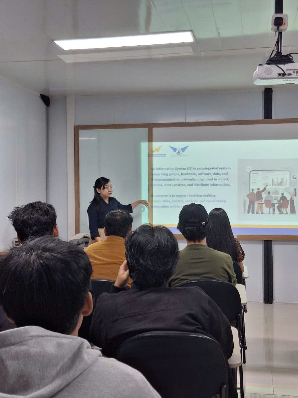 Trong buổi chiều, giảng viên Khoa CNTT – LHU đã thực hiện phiên giảng dạy đầu tiên với chủ đề Enterprise Information System. Nội dung bài giảng tập trung vào cấu trúc hệ thống thông tin doanh nghiệp, các yếu tố ảnh hưởng đến mức độ ứng dụng HTTT tại Việt Nam và quy trình triển khai hệ thống trong tổ chức. Sinh viên ESA Unggul tham gia thảo luận sôi nổi, đặc biệt ở phần so sánh mô hình hệ thống thông tin giữa Indonesia và Việt Nam. Một số tình huống thực tế được trình bày như HTTT của LHU, AI Chatbot, Shopee, TikTok và Lazada.