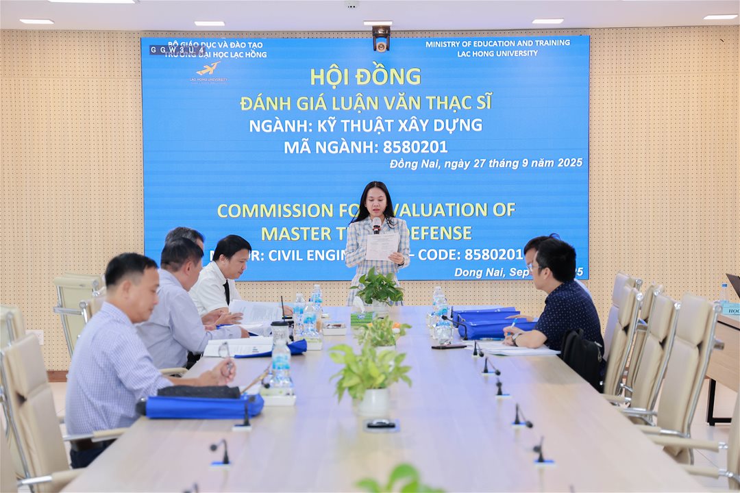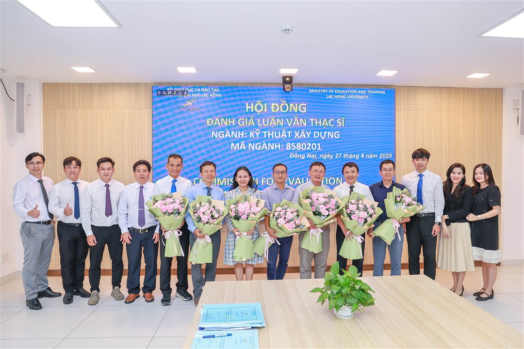 Ngày 27 tháng 9 năm 2025, tại phòng họp cơ sở 1 của Trường Đại học Lạc Hồng, 07 học viên ngành Kỹ thuật xây dựng đã xuất sắc hoàn thành và bảo vệ thành công luận văn thạc sĩ của mình. Buổi bảo vệ diễn ra trong không khí trang trọng và đầy tính học thuật, đánh dấu một bước ngoặt quan trọng trong hành trình học tập và nghiên cứu của các học viên.