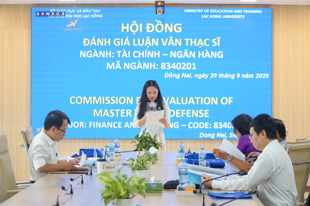 Ngày 29 tháng 9 năm 2025, tại phòng họp cơ sở 1 của Trường Đại học Lạc Hồng (LHU), Hội đồng đánh giá luận văn thạc sĩ chuyên ngành Tài chính - Ngân hàng đã tổ chức buổi bảo vệ luận văn cho 05 học viên. Buổi lễ diễn ra trong không khí trang trọng và đầy tính học thuật, với sự tham gia của các nhà khoa học, giảng viên uy tín và các chuyên gia đầu ngành.