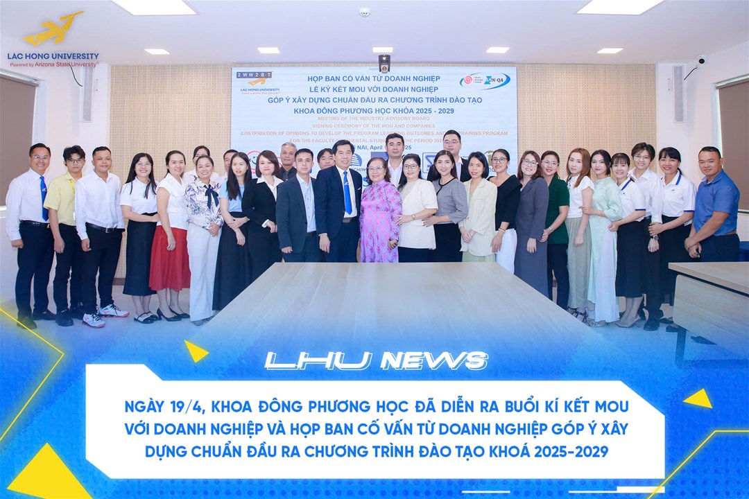 Sáng ngày 19/4/2025, khoa Đông Phương học Trường Đại học Lạc Hồng (LHU) đã ký kết hợp tác MOU cùng 05 Doanh nghiệp, họp ban cố vấn từ Doanh nghiệp và góp ý xây dựng chuẩn đầu ra, chương trình đào tạo.
