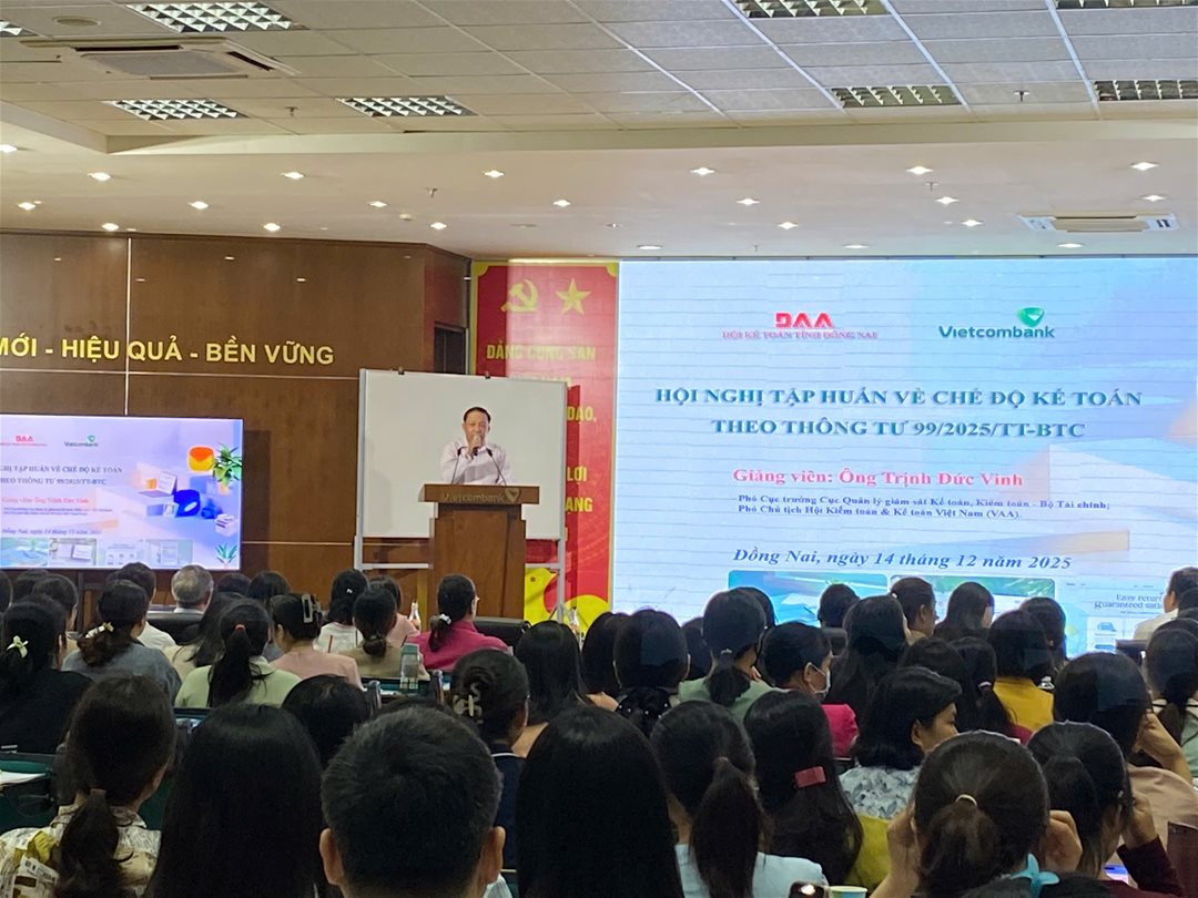 Nhằm kịp thời cập nhật các quy định mới về chế độ kế toán doanh nghiệp và nâng cao chất lượng đào tạo theo hướng bám sát thực tiễn, giảng viên Khoa Tài chính – Kế toán, Trường Đại học Lạc Hồng đã tham dự Hội nghị tập huấn triển khai Thông tư 99/2025/TT-BTC do Hội Kế toán tỉnh Đồng Nai tổ chức. Chương trình diễn ra vào ngày 14/12/2025, tại Hội trường Ngân hàng Vietcombank Đồng Nai.