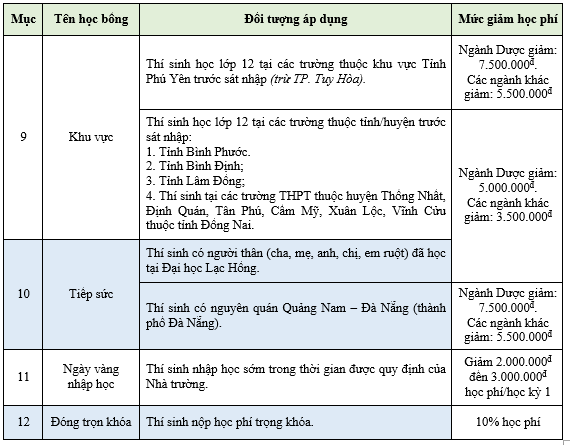 Trường Đại học Lạc Hồng luôn đồng cảm và thấu hiểu với hoàn cảnh của sinh viên, Nhà trường có nhiều chế độ chính sách dành cho sinh viên như: Học bổng thủ khoa; học bổng khoa học công nghệ; học bổng nữ sinh theo học các khối ngành kỹ thuật; học bổng cán sự lớp; học bổng doanh nghiệp; học bổng ưu tiên theo khu vực; học bổng dành cho 2 anh/chị/em ruột cùng học Lạc Hồng,…